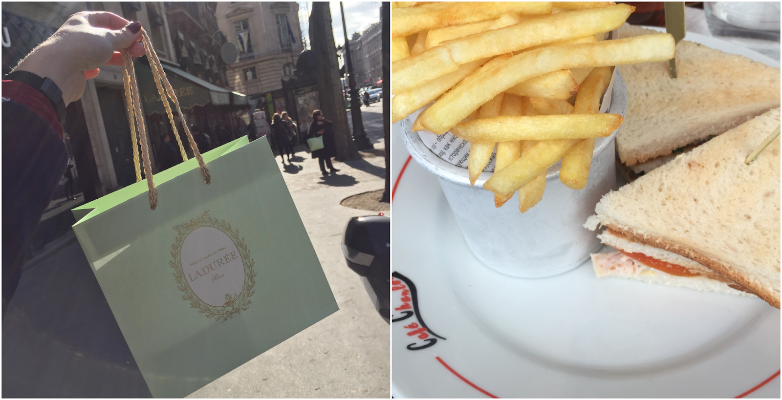 En dat werd... Ladurée. Na al die keren Parijs werd het toch echt eens tijd om de 'originele' macarons uit te proberen. Ik heb ze al van allerlei winkels geprobeerd, maar dus nog nooit deze (vooral vanwege de prijs denk ik). En ik kan jullie alvast verklappen dat de variant met cassis-smaak overheerlijk was.
